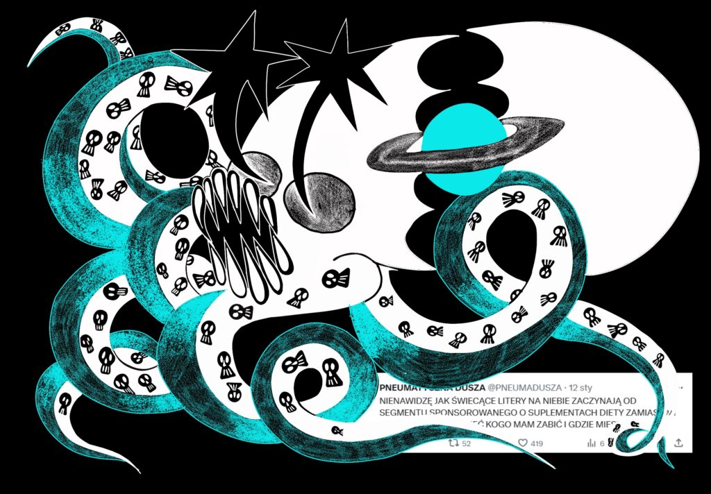 Jeżeli chodzi o bestiariusz i całe fantastyczno-makabryczne imaginarium DUSZY, to powiedziałbym że mimo pewnego baroku jest ono wewnętrznie spójne. Na podstawie własnych obserwacji wpisów tego konta na przestrzeni lat, we wpisach DUSZY wyraźnie czuć ich osobę autorską, pewien konkretny rodzaj wrażliwości artystycznej i absurdystycznego poczucia humoru obecny we wszystkich tweetach. Nie ma się wrażenia pomieszania z poplątaniem, przeciwnie, mimo eklektyczności po jakimś czasie obcowania z twórczością DUSZY w zasadzie nie da się jej pomylić z nikim innym. Prawdopodobnie jednak wynika to bardziej ze spontaniczności pisania niż jego staranności. Mimo mojego afirmatywnego podejścia do postrzegania twórczości DUSZY jako sztuki, jako literatury, nie mam wątpliwości że przez samą formę i platformę, a więc limit znaków i fakt że wpisy osoby autorskiej często powstają jako dyskursywna reakcja na dane zjawisko/ wydarzenie, prawdopodobnie jego wpisy powstają raczej w przypływie artystycznej inspiracji i afektu, aniżeli starannego planowania. W moich oczach to ich nie dewaluuje, taki jest po prostu charakter twitterowych mikrofikcji jako formy literackiej.