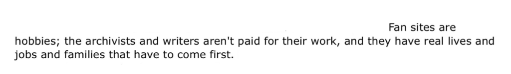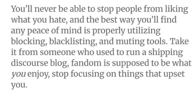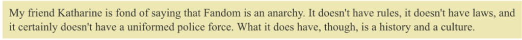 Post ten jest krytyczny wobec kompilacji zasad narzucanych fankom, podobnie jak wyżej wymieniony esej Nature vs. Culture.  Autorka zwraca szczególną uwagę na różnorodność fandomów oraz możliwość podzielonych opinii wśród fanek w jednym fandomie. W dobie internetu, zakres wyrażanych perspektyw może być niepojęcie szeroki, więc standaryzacja całości cyfrowej przestrzeni jest wręcz niemożliwa. Autorka podkreśla również niebezpieczeństwo związane z dyktowaniem norm społecznych, podatnych na reakcjonistyczne i konserwatywne retoryki, w subkulturze tworzonej głównie przez kobiety i osoby queerowe.