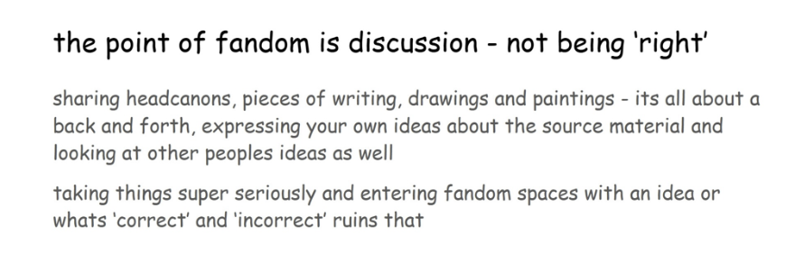 Zanika także poczucie wspólnoty tożsamościowej w swojej małej, cyfrowej ojczyźnie. Fanki zderzają się z bezprecedensową ilością osób interpretujących i doświadczających ich ulubione dzieła w inny sposób od nich samych. Zasady wymienione w tym poście odpowiadają na tą indywidualność i ją normalizują.