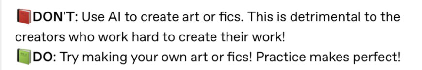 Ten post skupia się konkretnie na etykiecie związanej z pisaniem, czytaniem, dystrybucją oraz ogólnym docenianiem fanfików. Obok omówionych wyżej zagadnień „nie lubisz; nie czytasz”, nierozprzestrzeniania cudzej twórczości bez zgody czy unikania nielubianych treści, pojawia się też punkt o nie korzystaniu ze sztucznej inteligencji przy tworzeniu fanfików. Jest to wyraźna reakcja na nowy problem w nawigowaniu przestrzeni cyfrowych, jakim jest przesyt materiałów wygenerowanych przez sztuczną inteligencję. Zachowanie integralności największego obecnie repozytorium fanfików, Archive Of Our Own (AO3), wydaje się być główną motywacją w stworzeniu tej listy. Każdy punkt odnosi się do utrzymywania jakości tekstów fanowskich, zachęcania autorek tekstów fanowskich do pisania albo podtrzymywaniu funkcjonalności systemu tagowania strony. Krytyka fanowskiej twórczości jest kategorycznie zabroniona, niezależnie od tego czy jest konstruktywna czy nie.