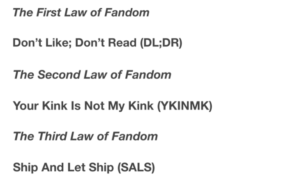 Meta post użytkowniczki ozhawkauthor pt. The Three Laws of Fandom został wstawiony na platformę Tumblr w 2016 roku i proponowane w nim zasady savoir-vivre’u są wciąż stale przywoływane w autokrytycznych dyskusjach fanowskich[5]. Jak wskazuje tytuł, tekst ten wyznacza trzy podstawowe „prawa” fandomu: